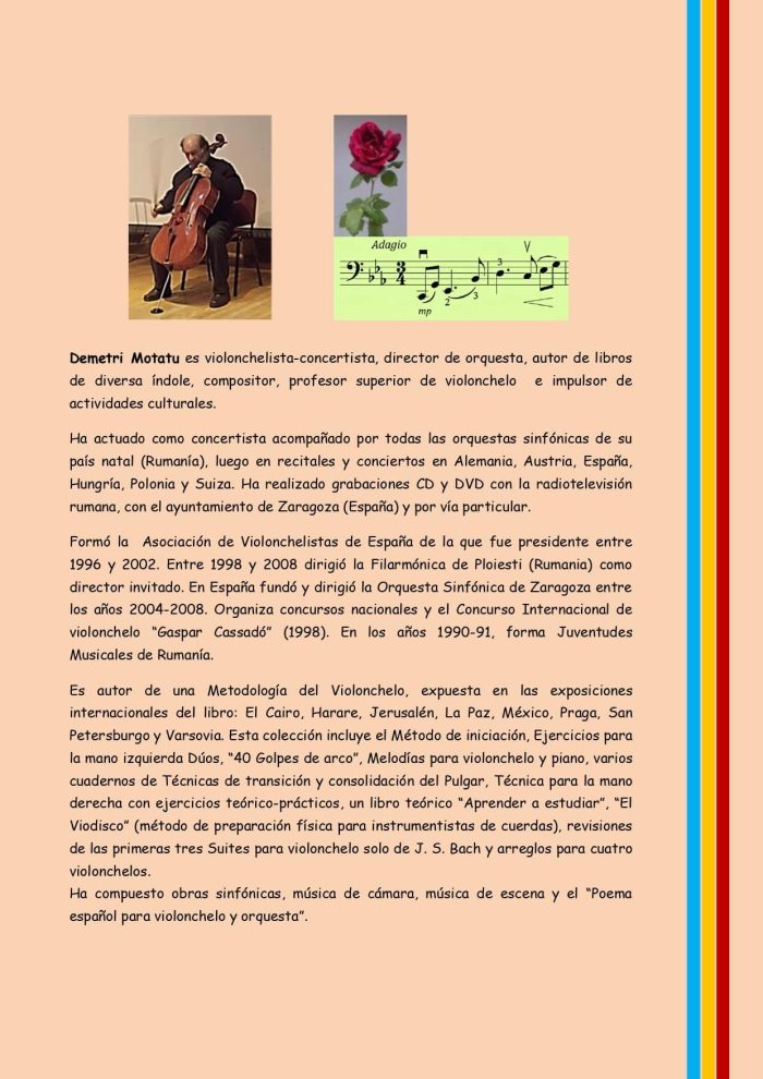 Demetri Motatu es violonchelista-concertista, director de orquesta, autor de libros, compositor (el “Poema para violonchelo y orquesta sinfónica”, cuarteto de cuerda, trio, etc.), profesor superior de violonchelo con una amplia experiencia pedagógica. Organizador de varios concursos nacionales de violonchelo y del Concurso internacional “Gaspar Cassadó” (1998) así como numerosas clases magistrales. Fue fundador y presidente de la Asociación de Violonchelistas de España. Durante diez años fue director invitado permanente de la Filarmónica de Ploiesti / Rumanía). Fundó y dirigió la Orquesta Sinfónica de Zaragoza entre los años 2004 y 2008. Entre otras actividades destaca la de fundador de “Jeunesses Musicales” de Rumania, (1990) y su representante en Bruselas/Bélgica. Como concertista actúa con todas las orquestas sinfónicas de Rumanía y en numerosísimos recitales y conciertos en España, Alemania, Rumanía, etc. Su metodología fue expuesta en varias ferias internacionales del libro (Praga, Varsovia, San Petersburgo, La Paz, etc.).